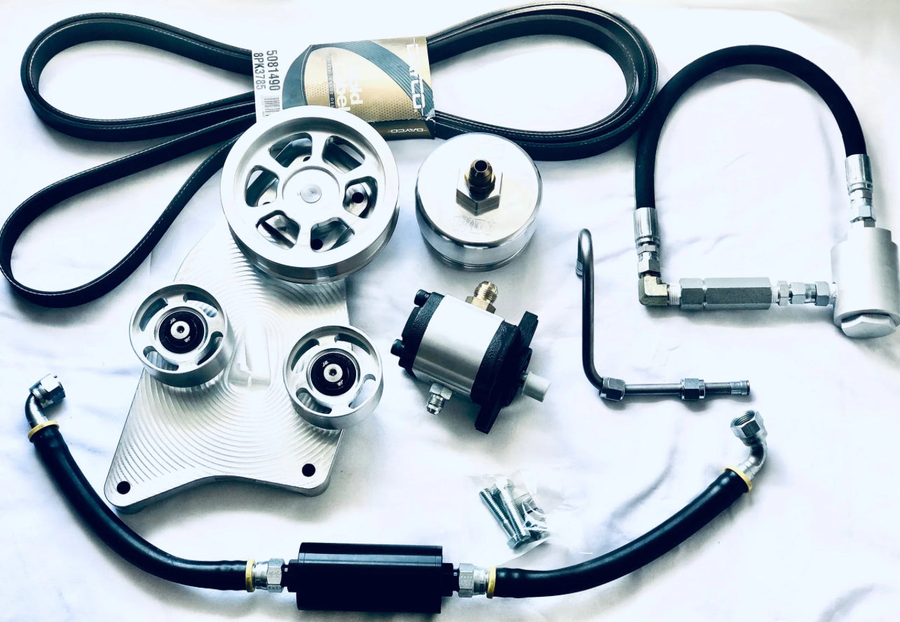 Le nouveau kit HPOP double entièrement billet et amélioré. Support et poulies en aluminium CNC usinés en interne. La conception améliorée réduit de 4 livres et prolonge la durée de vie de la pompe secondaire. Ce kit est recommandé pour les gros injecteurs de compétition (350 conventionnels, 430 hybrides 7mm, 500/400 hybrides 8mm, ect). Le tuyau CAC côté chaud devra être modifié pour dégager la pompe. Le kit comprend un support de pompe double, une pompe, une poulie d'entraînement, des poulies de renvoi, un clapet anti-retour, un bouchon de filtre à huile, une conduite d'alimentation basse pression, des conduites haute pression et tous les raccords nécessaires à l'installation. Revêtement en poudre disponible.